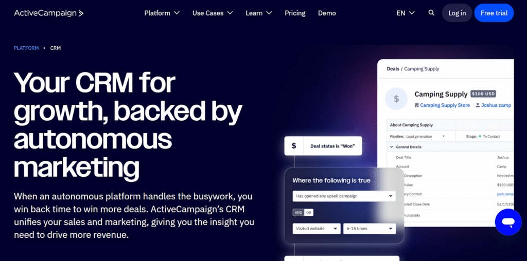 ActiveCampaign is well-known for its marketing automation but it’s not the only tool the platform is offering. Its CRM is powerful and is created for marketers striving to build meaningful relationships using personalized interactions. With this service, you’ll have your customer data, behavioral insights, and sales pipelines unified, enabling seamless transitions from marketing to conversion.