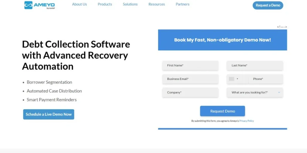 An Indian cloud communications provider, AMEYO, provides a dedicated collections package, which is an integration of a contact center and a debt recovery automation. The platform offers omnichannel communication features such as voice, SMS, email, and WhatsApp integration to give the collection teams various touchpoints to reach borrowers. The solution provided by AMEYO has such features as predictive dialing, automated calling campaigns, and intelligent call routing, which maximize the productivity of the agents.